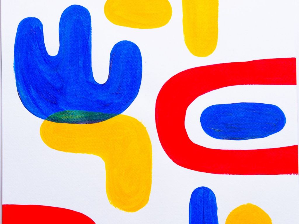 Paint bold, flat shapes in contrasting or complementary colors. Use painter’s tape for crisp edges and stick to a 3–4 color palette for simplicity. This builds your understanding of composition and color harmony.