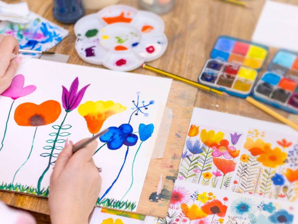 Paint basic shapes like petals or leaves. Start realistic or stylized, then add layers for depth. It improves brush handling and shading skills.